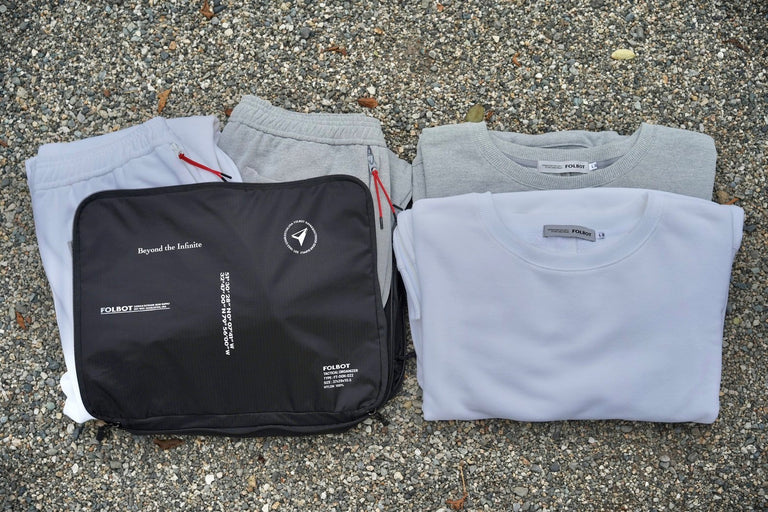 広げた場合はスウェットのセットアップが2セット程度入る大容量です。マチを広げた状態で衣類を入れて、マチ調整用のファスナーを閉じればコンプレッション出来ます。(内容物によっては閉じられません)