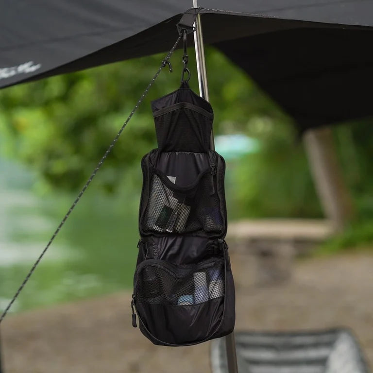 (M)は薬やボトルなどの小物をまとめられるサイズ感。虫よけスプレー"TACTICAL PROTECT"もぴったり入ります。メッシュの中にはボトルが動かないように固定するゴムバンドが縫い付けられています。上部にはフックが付いているので、テント内、車内、ホテルのバスルームなどに吊るして使うことが出来ます。
