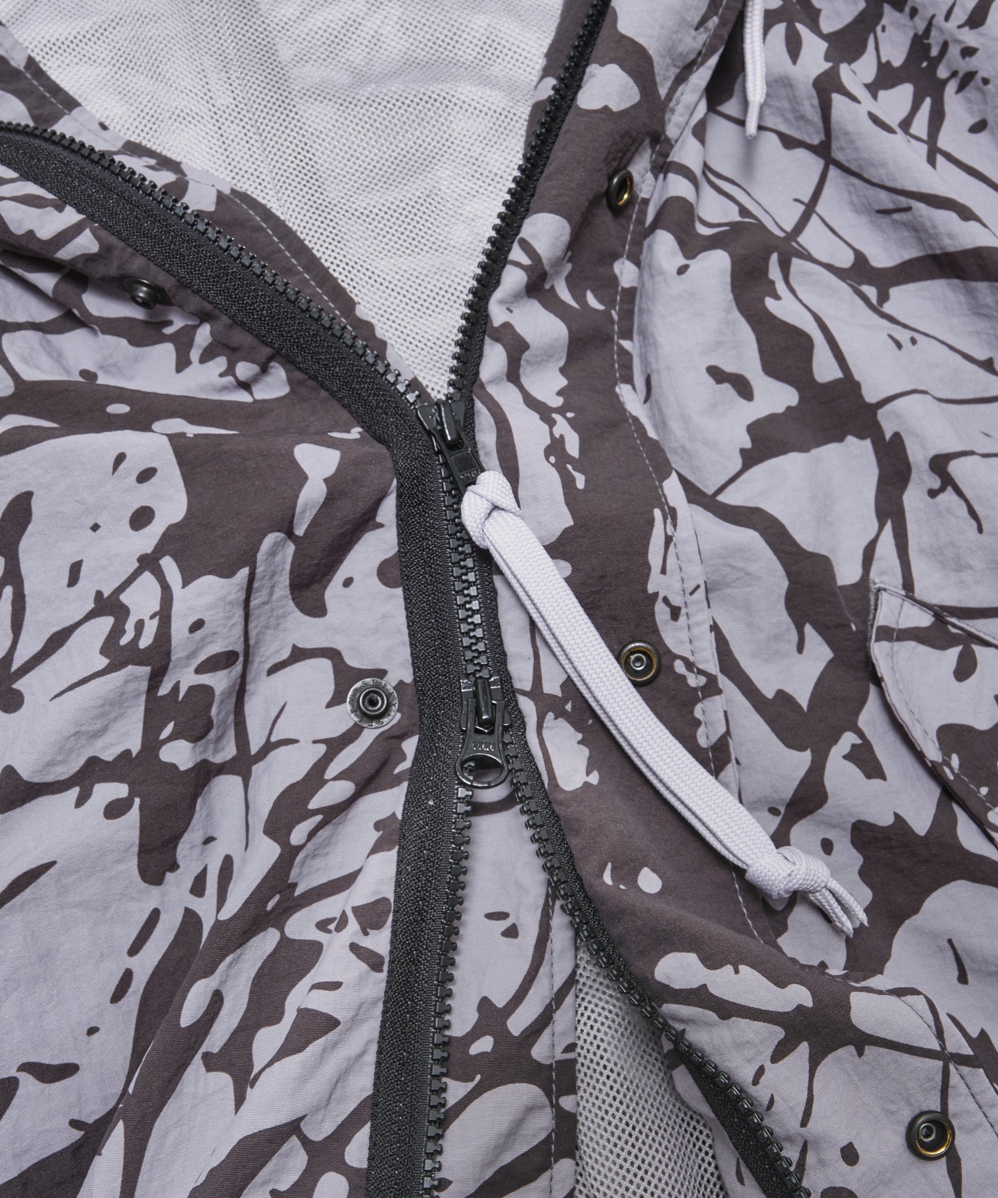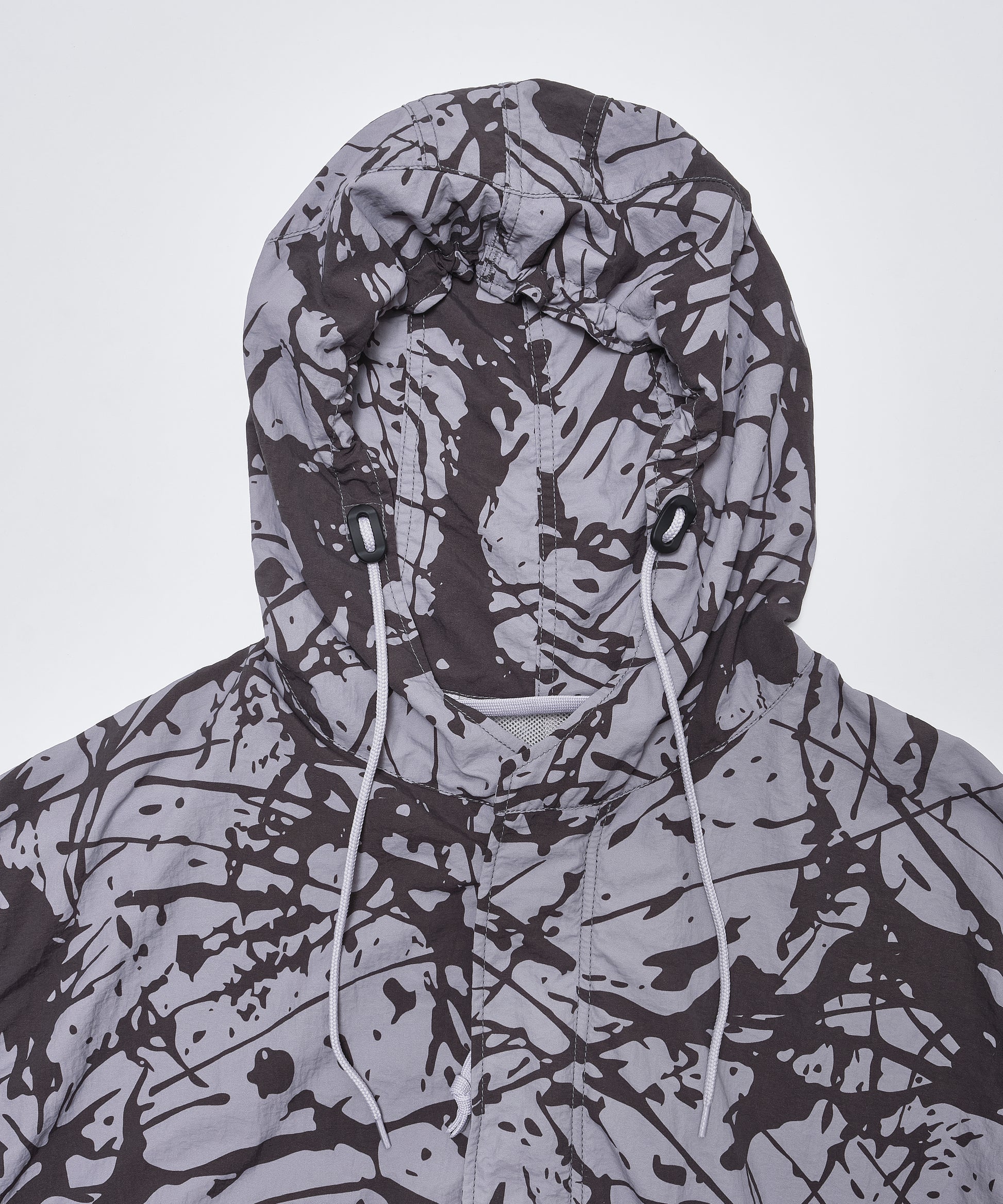 シーズンのフィーチャーパターン”Splatrail”をまとった、ダイナミックかつユニークな表情のモッズコート。濡れたトレイルやその跳ね返りの瞬間をイメージソースにしたグラフィックが、存在感を放ちます。素材には、軽量で速乾性に優れたタスランナイロンを使用。裏地には通気性の高いメッシュ素材を配しています。フード口・ウエスト・裾にはドローコードを備え、シルエットの調整が可能。さらに、ブランドのアイコンである太幅のベルクロカフも健在です。