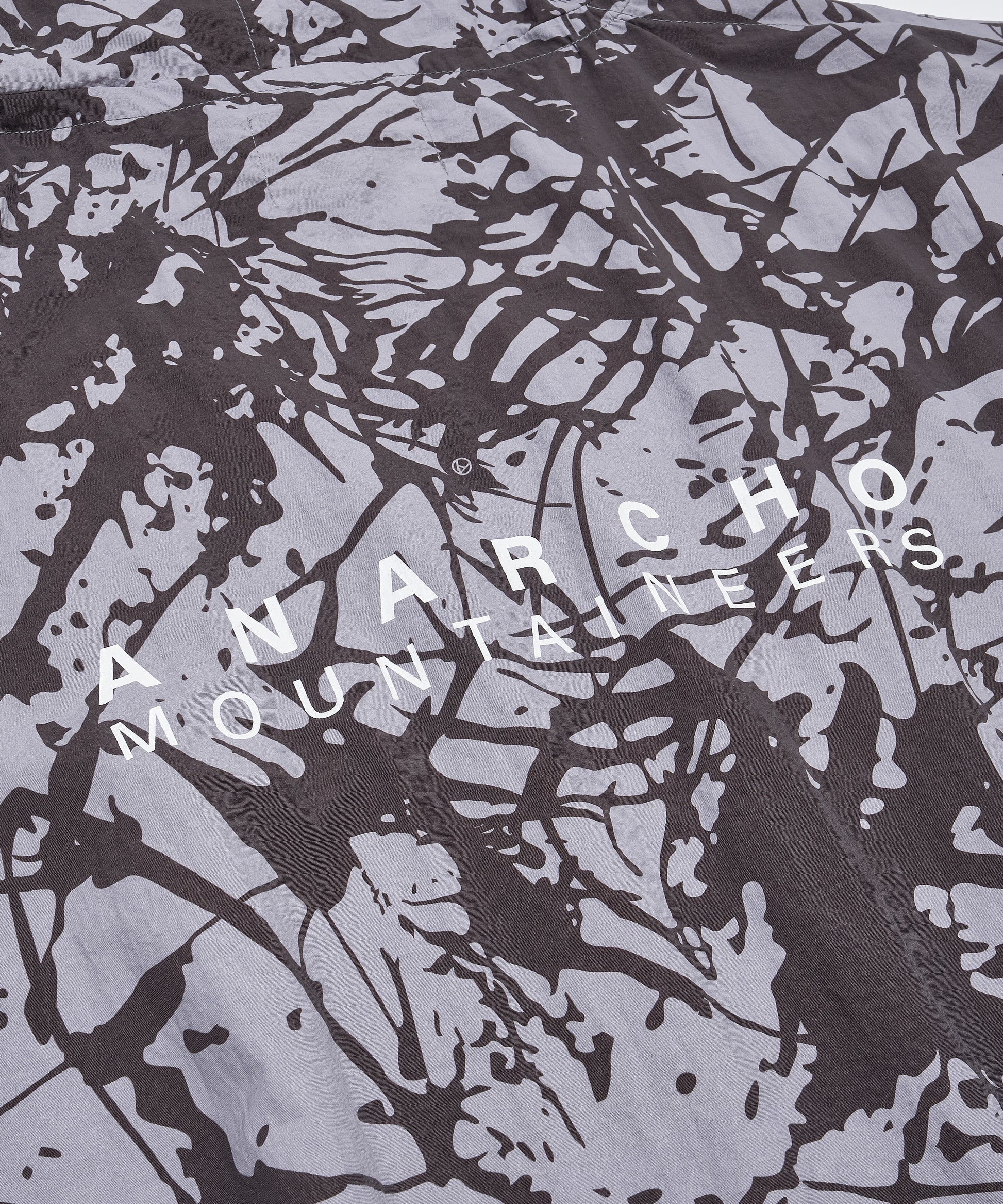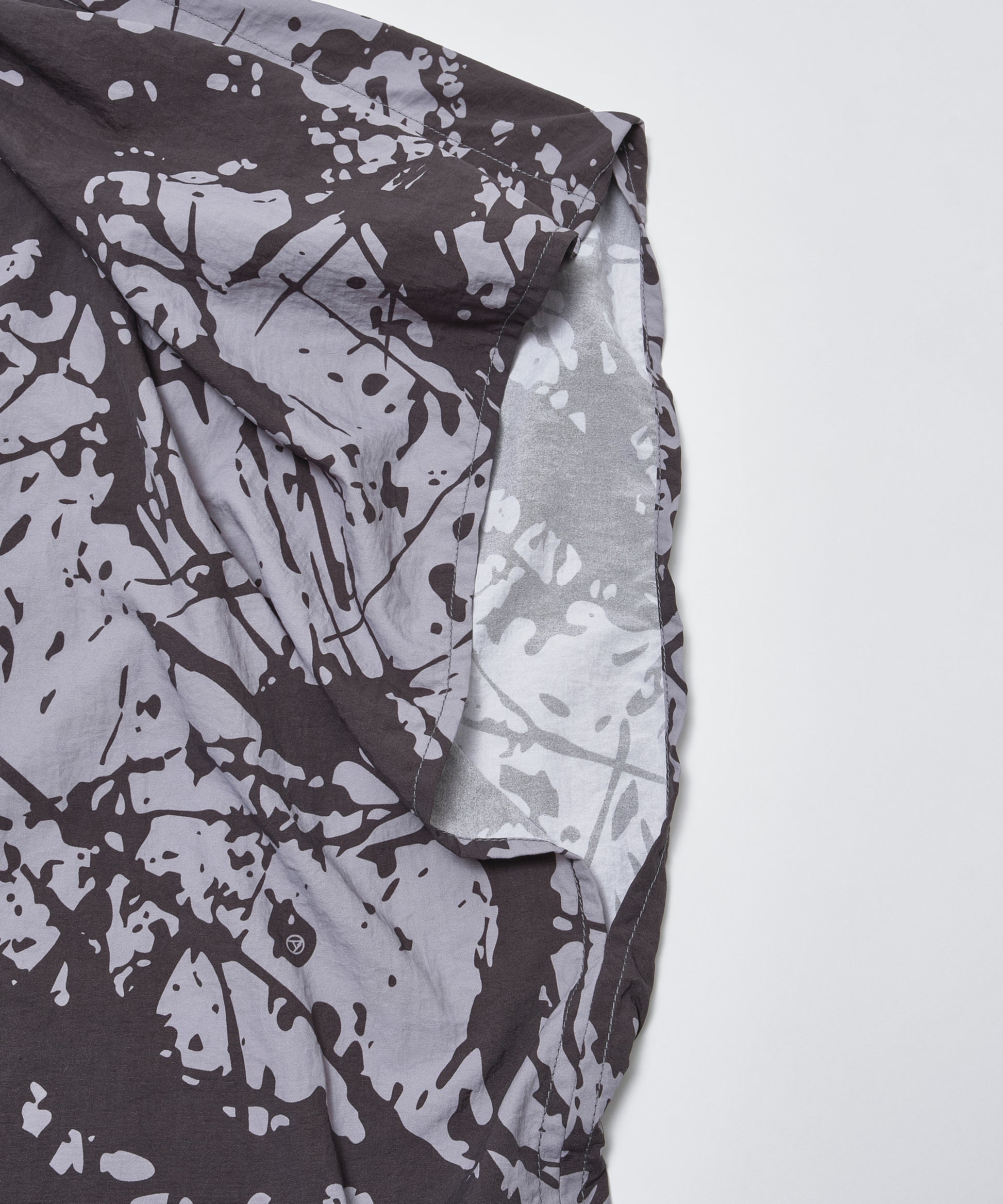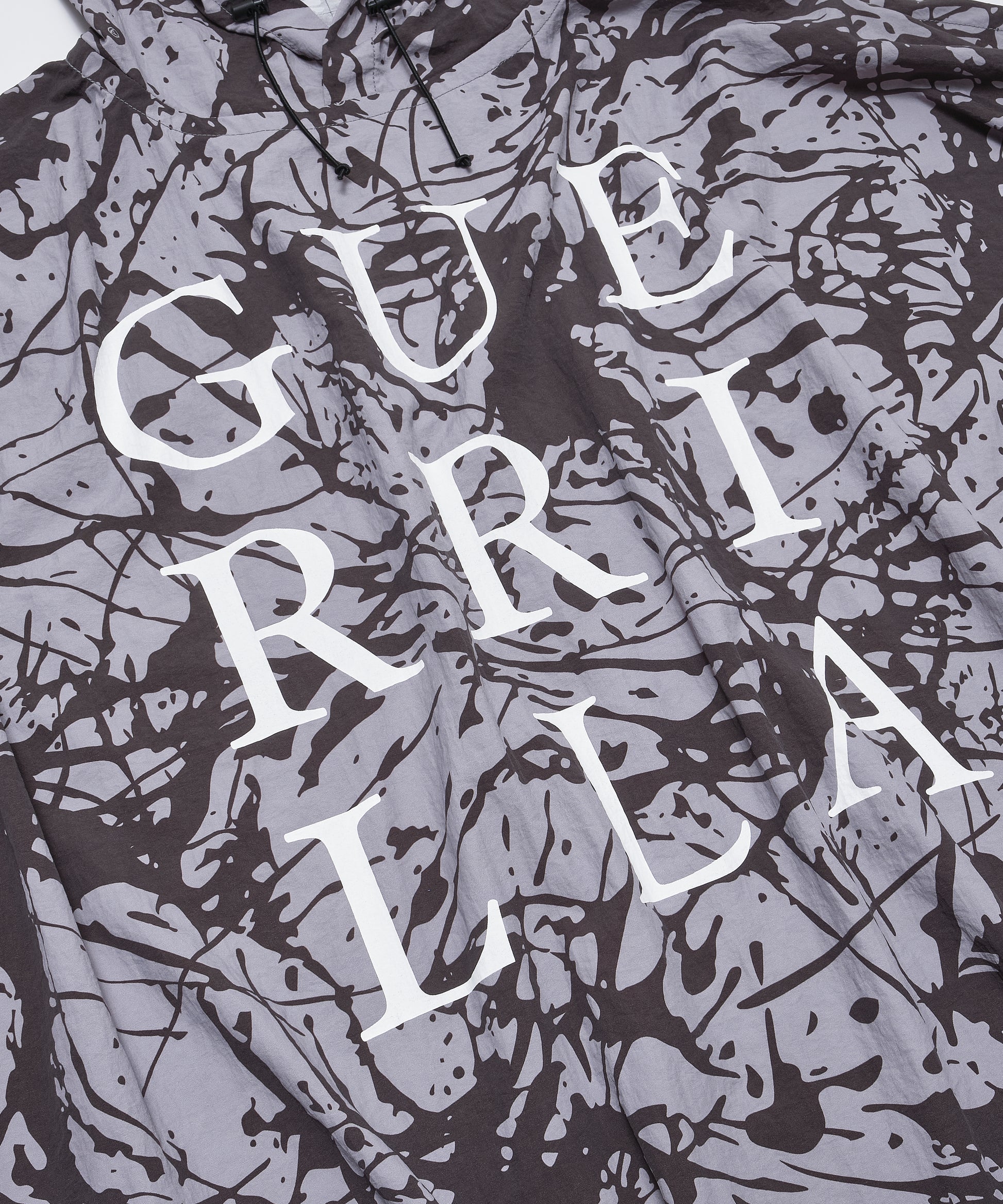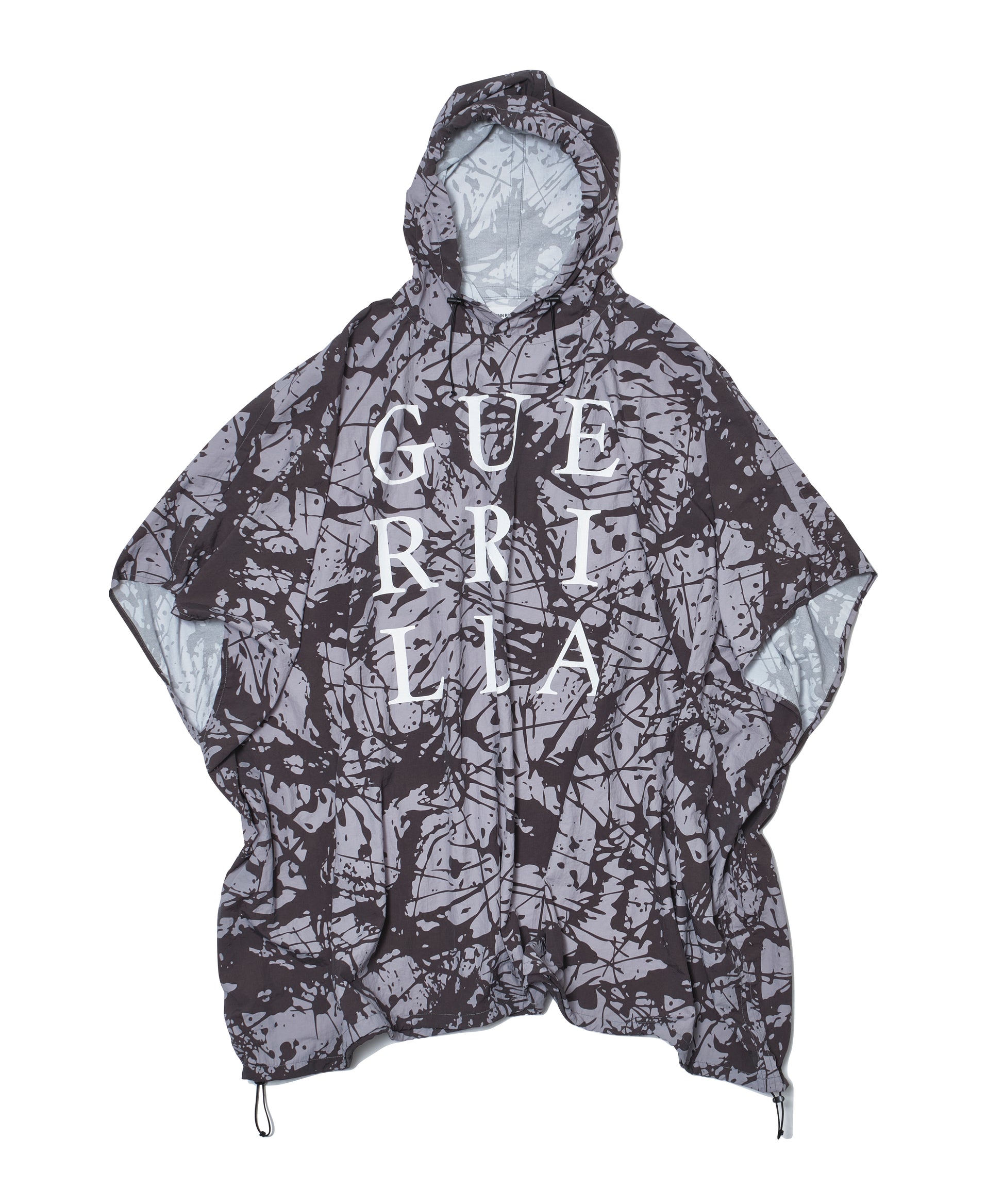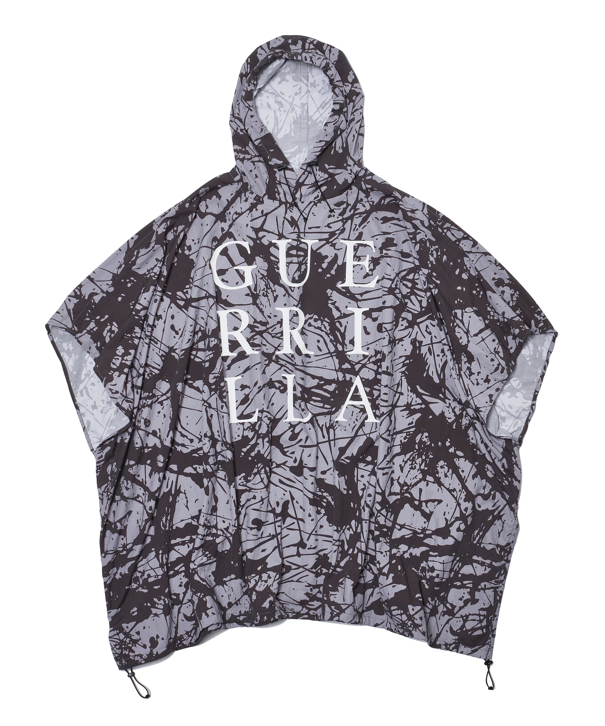 シーズンのフィーチャーパターン”Splatrail”をまとった、ダイナミックかつユニークな表情のポンチョ。濡れたトレイルやその跳ね返りの瞬間をイメージソースにしたグラフィックが、存在感を放ちます。素材には、軽量で速乾性に優れたタスランナイロンを使用。フロントの”GUERRILLA”は、シーズンテーマに登場するRATMのソングタイトルに由来するワード。決して過激な思想ではありません。