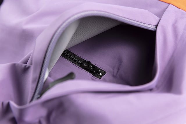 unfudgeのビブパンツと合わせることで、パンツ胸ポケットへ最小限の開口でアクセスできるスリットです。風や雪の激しい日にウェア内へと侵入する冷気を最小限に抑えます。